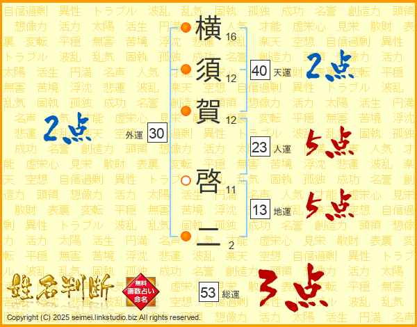 横(16画)須(12画)賀(12画) 啓(11画)二(2画)