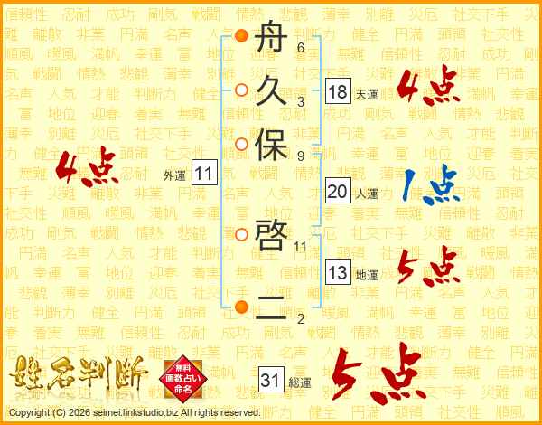 舟久保啓二さんの総運は31画の5点!