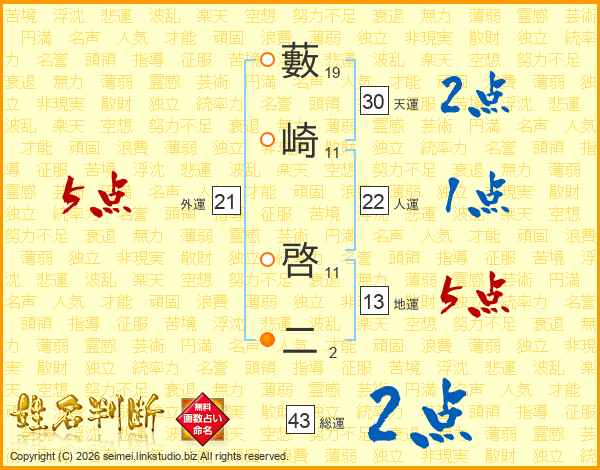 藪崎啓二さんの人運は22画の1点!