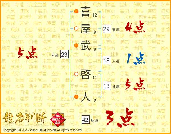 喜(12画)屋(9画)武(8画) 啓(11画)人(2画)