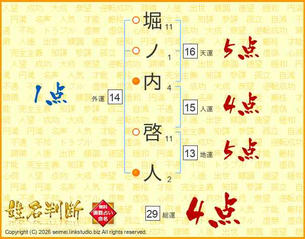堀(11画)ノ(1画)内(4画) 啓(11画)人(2画)
