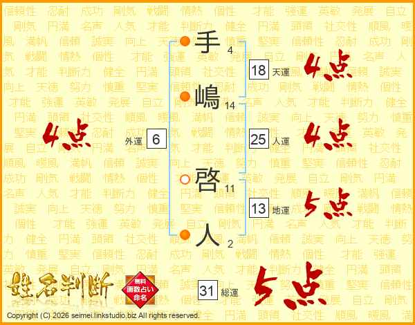 手嶋啓人さんの総運は31画の5点!