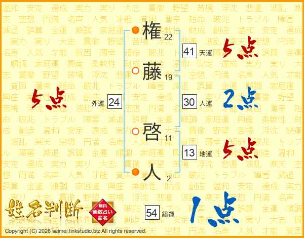 権(22画)藤(19画) 啓(11画)人(2画)