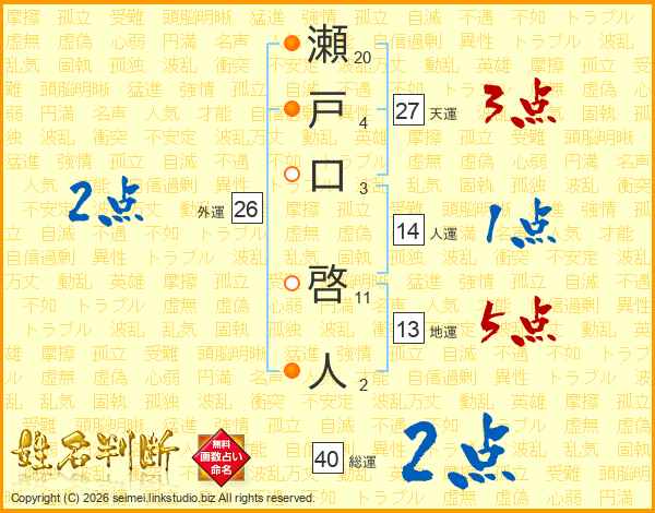 瀬戸口啓人さんの天運は27画の3点!