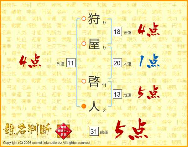 狩(9画)屋(9画) 啓(11画)人(2画)