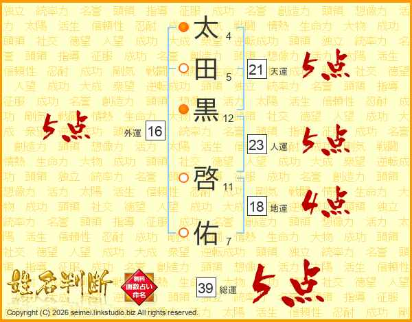 太(4画)田(5画)黒(12画) 啓(11画)佑(7画)