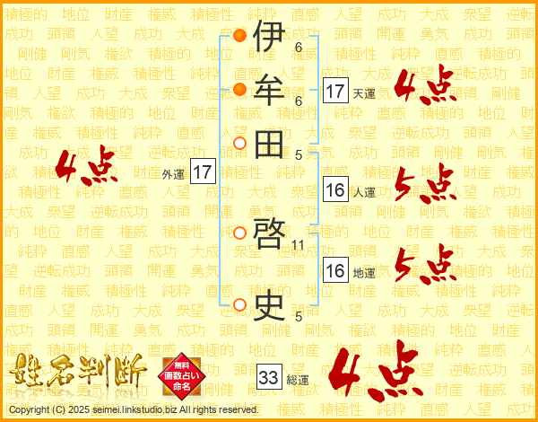 伊(6画)牟(6画)田(5画) 啓(11画)史(5画)