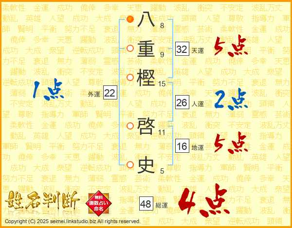 八(8画)重(9画)樫(15画) 啓(11画)史(5画)
