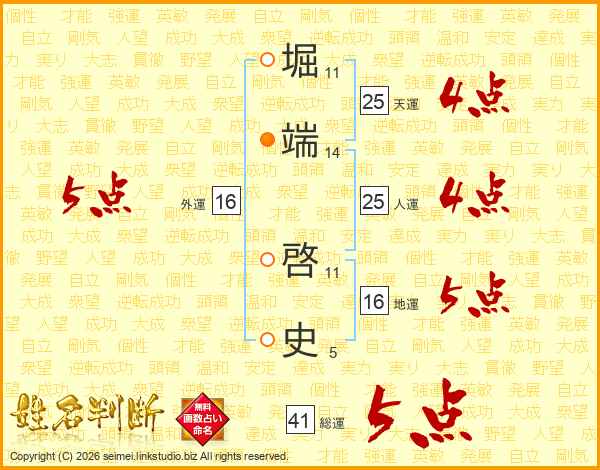 生活面を象徴する運勢です。外部から受ける影響力を表し、結婚運、家庭運や職場、環境への順応性を表します。総運から人運を引いた画数。姓や名が1文字の場合を除く。
