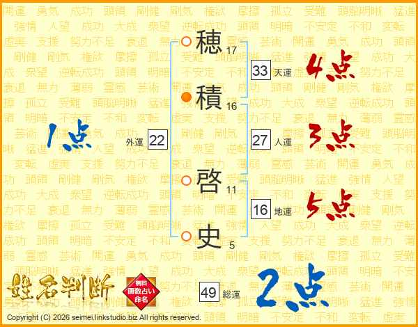 画数の奇数(○陽)と偶数(●陰)の配列で吉凶を占います。どちらかにかたよる名前は大凶名で避ける必要があります。画数の奇数偶数。