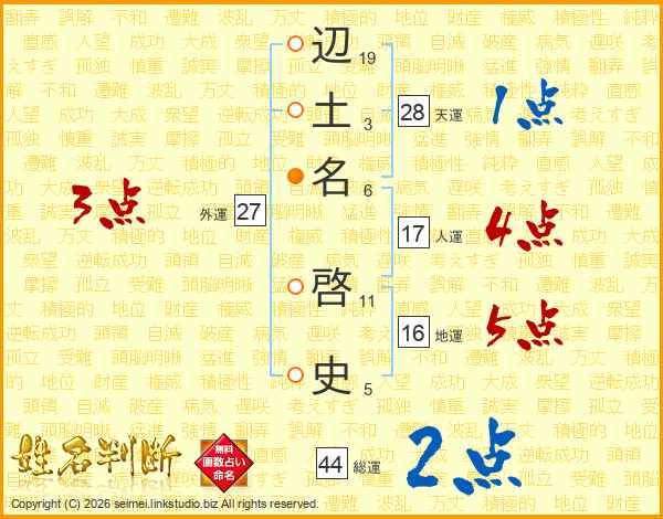 辺(19画)土(3画)名(6画) 啓(11画)史(5画)