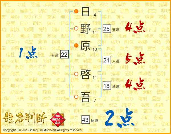 日(4画)野(11画)原(10画) 啓(11画)吾(7画)