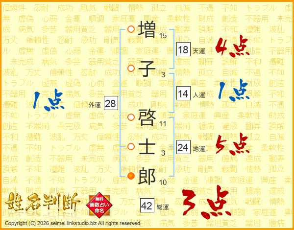 増(15画)子(3画) 啓(11画)士(3画)郎(10画)