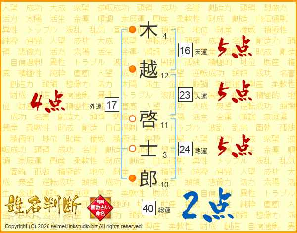 木(4画)越(12画) 啓(11画)士(3画)郎(10画)