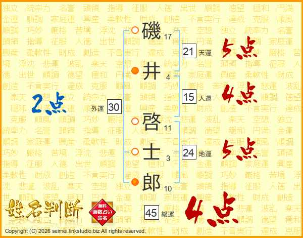 磯井啓士郎さんの総運は45画の4点!