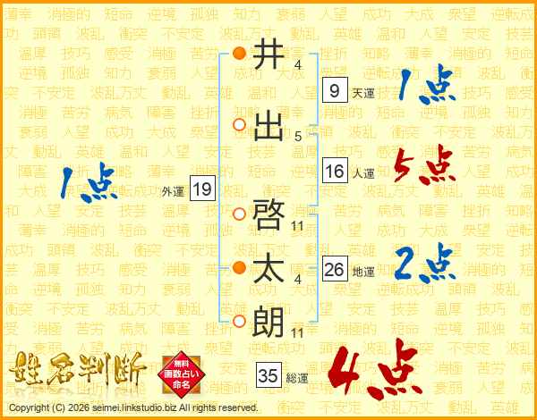 井(4画)出(5画) 啓(11画)太(4画)朗(11画)