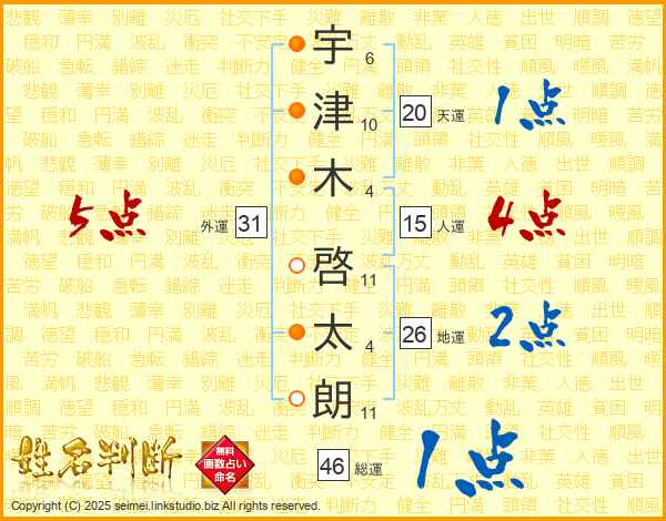 宇(6画)津(10画)木(4画) 啓(11画)太(4画)朗(11画)