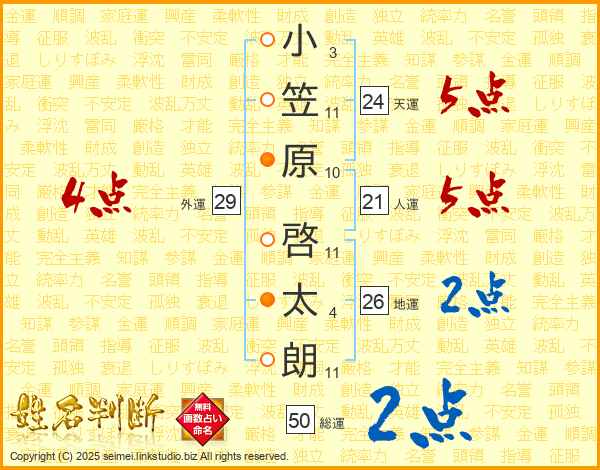 小(3画)笠(11画)原(10画) 啓(11画)太(4画)朗(11画)