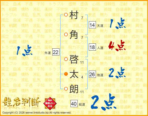 村(7画)角(7画) 啓(11画)太(4画)朗(11画)