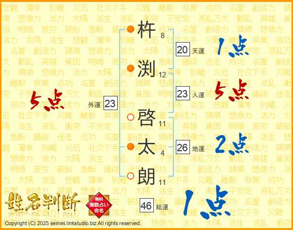杵(8画)渕(12画) 啓(11画)太(4画)朗(11画)