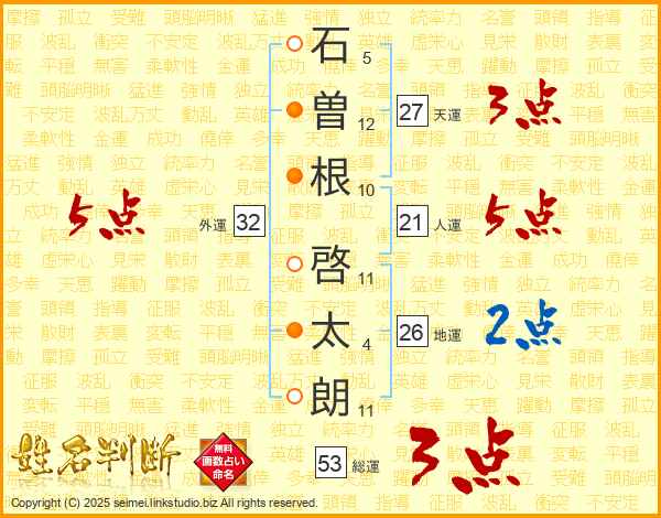 石(5画)曽(12画)根(10画) 啓(11画)太(4画)朗(11画)