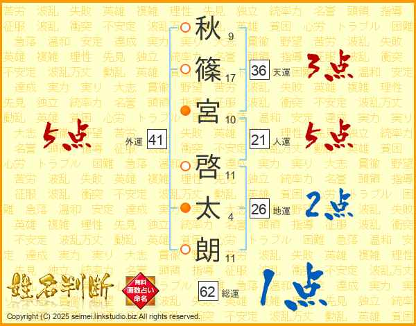 秋(9画)篠(17画)宮(10画) 啓(11画)太(4画)朗(11画)