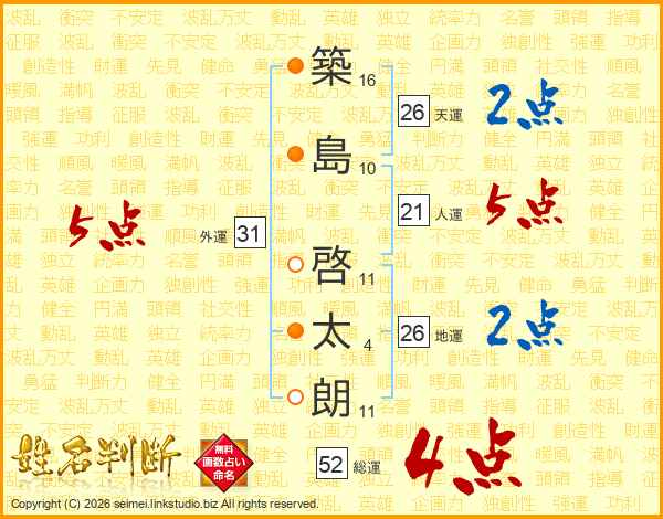 築(16画)島(10画) 啓(11画)太(4画)朗(11画)