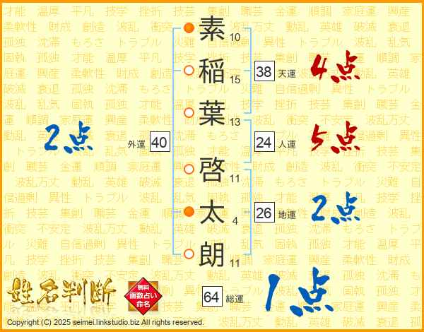 素(10画)稲(15画)葉(13画) 啓(11画)太(4画)朗(11画)