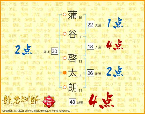 蒲谷啓太朗さんの地運は26画の2点!