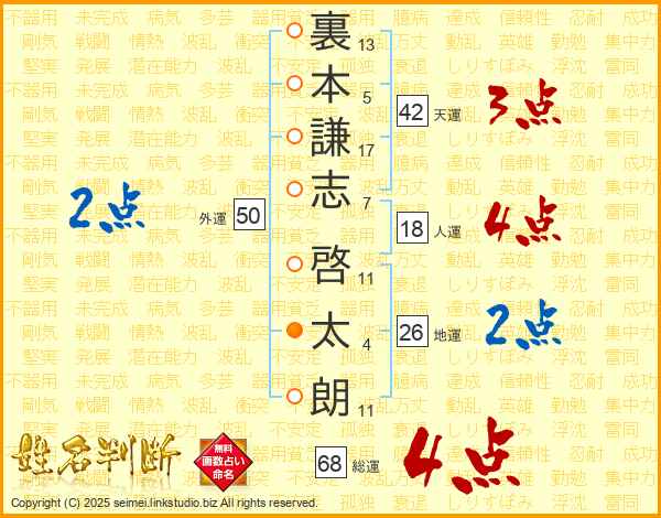 裏本謙志啓太朗さんの総運は68画の4点!