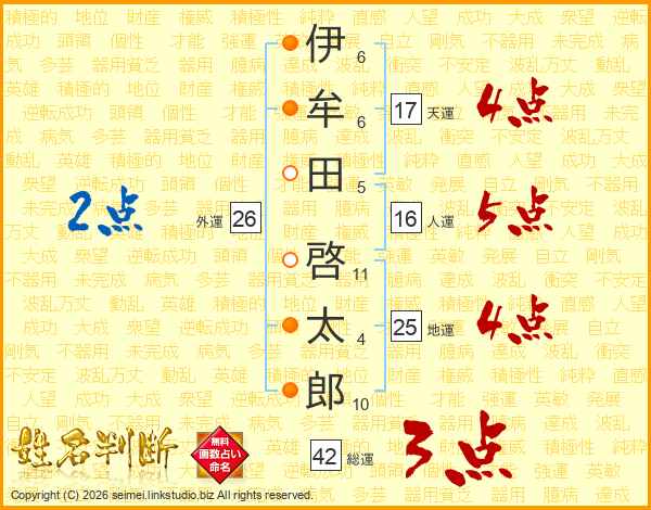 伊(6画)牟(6画)田(5画) 啓(11画)太(4画)郎(10画)