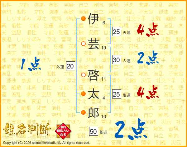 伊(6画)芸(19画) 啓(11画)太(4画)郎(10画)