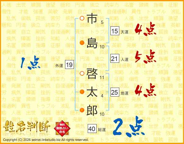 市(5画)島(10画) 啓(11画)太(4画)郎(10画)
