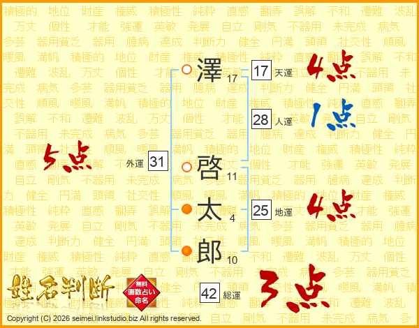 澤(17画) 啓(11画)太(4画)郎(10画)