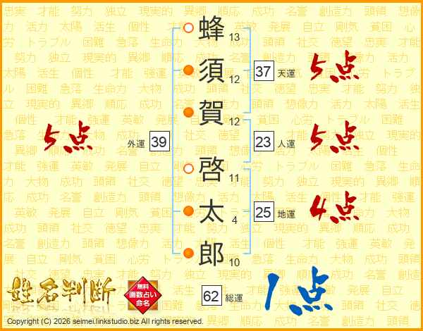 蜂(13画)須(12画)賀(12画) 啓(11画)太(4画)郎(10画)