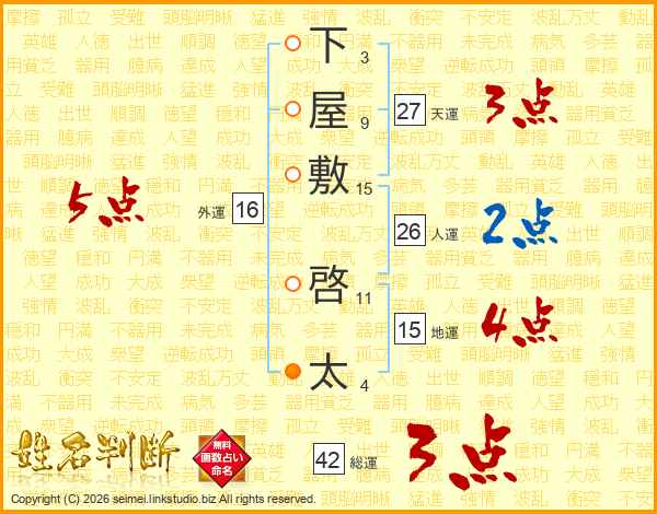 下(3画)屋(9画)敷(15画) 啓(11画)太(4画)