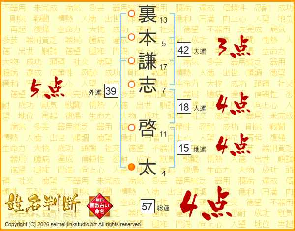 裏(13画)本(5画)謙(17画)志(7画) 啓(11画)太(4画)
