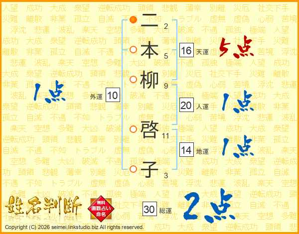 二(2画)本(5画)柳(9画) 啓(11画)子(3画)