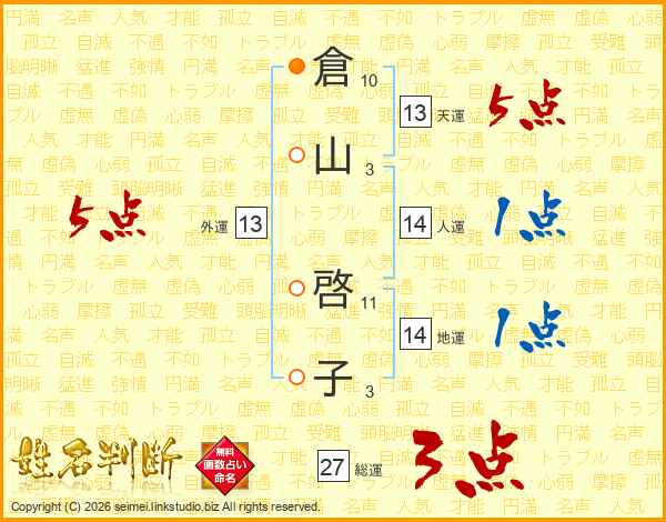 生活面を象徴する運勢です。外部から受ける影響力を表し、結婚運、家庭運や職場、環境への順応性を表します。総運から人運を引いた画数。姓や名が1文字の場合を除く。