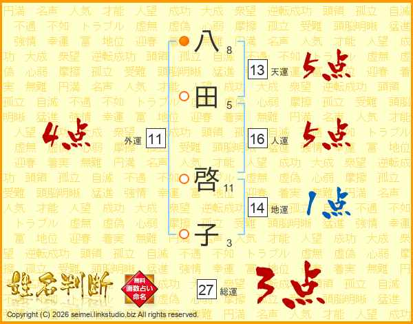 あなたの人生を表す1番重要な運勢です。生涯を通じて影響する総合運となり、主に50歳以降の晩年期に影響を及ぼします。苗字と名前の合計画数。