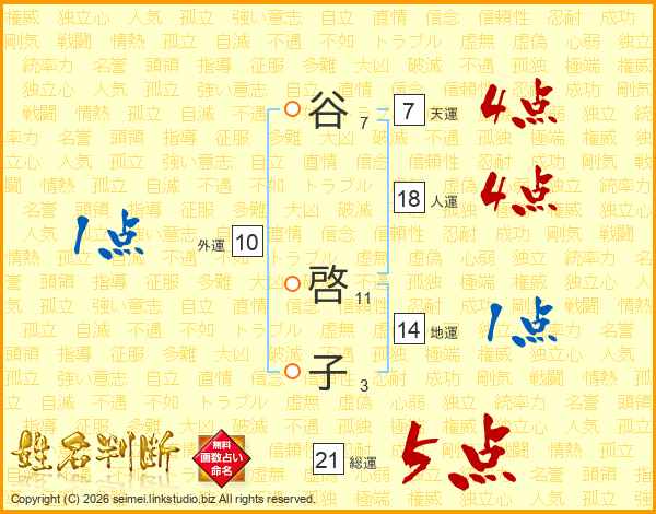 生活面を象徴する運勢です。外部から受ける影響力を表し、結婚運、家庭運や職場、環境への順応性を表します。総運から人運を引いた画数。姓や名が1文字の場合を除く。