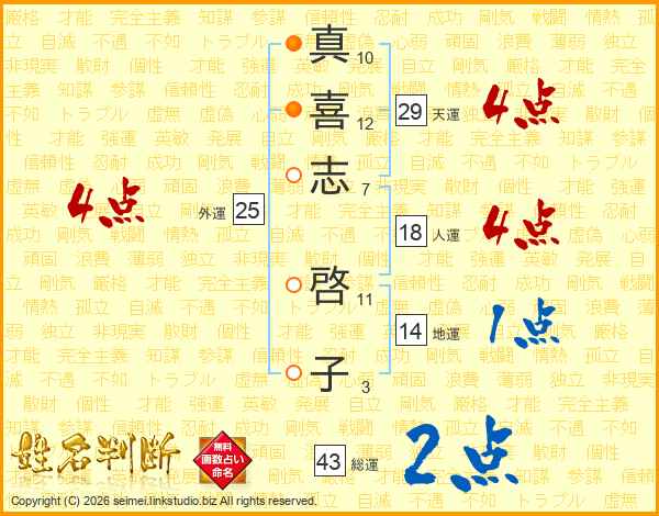 真(10画)喜(12画)志(7画) 啓(11画)子(3画)