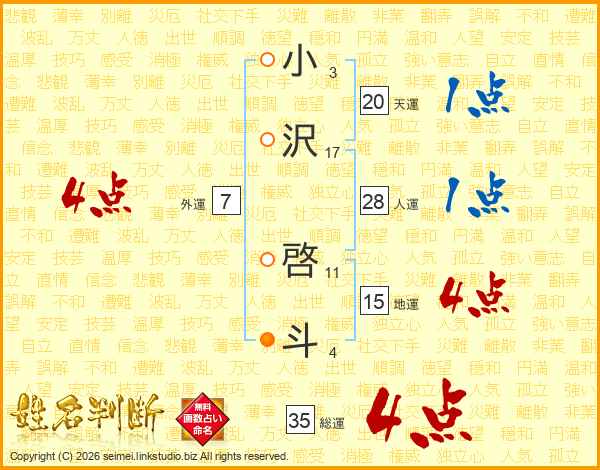 小(3画)沢(17画) 啓(11画)斗(4画)