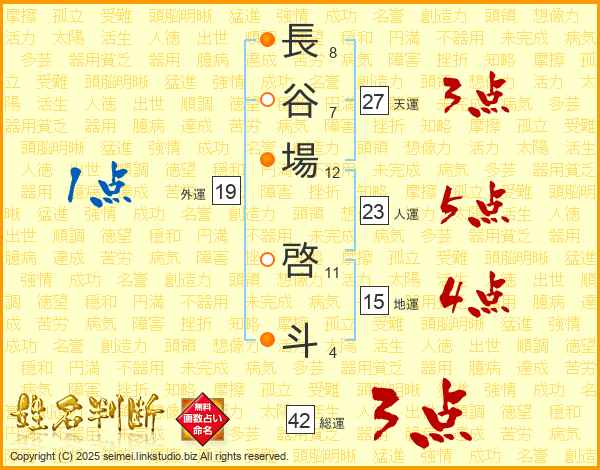 長(8画)谷(7画)場(12画) 啓(11画)斗(4画)