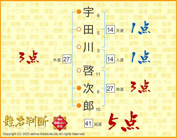 宇(6画)田(5画)川(3画) 啓(11画)次(6画)郎(10画)