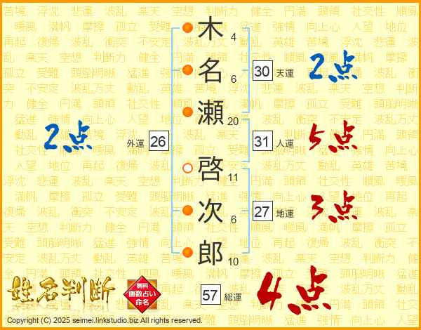 木(4画)名(6画)瀬(20画) 啓(11画)次(6画)郎(10画)