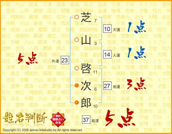 芝(7画)山(3画) 啓(11画)次(6画)郎(10画)