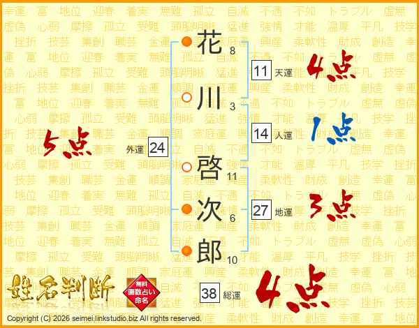 花川啓次郎さんの総運は38画の4点!