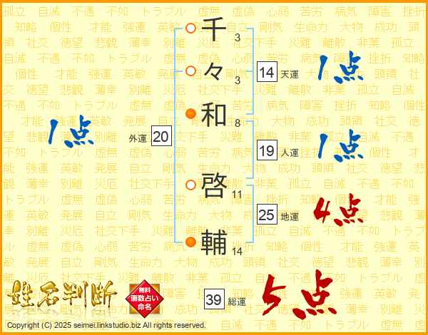 千(3画)々(3画)和(8画) 啓(11画)輔(14画)