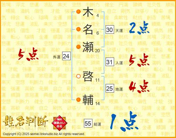 木(4画)名(6画)瀬(20画) 啓(11画)輔(14画)